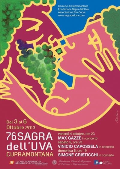 Tra le prime in Italia in ordine di tempo (la prima edizione fu celebrata il 23 settembre 1928), si tiene da decenni ormai nella PRIMA DOMENICA DI OTTOBRE E SABATO, VENERDI' E GIOVEDI' PRECEDENTI. E' la festa del raccolto, ma anche della fecondita' della terra, in questa zona particolarmente ricca di vigneti coltivati a Verdicchio. LA SAGRA DELL'UVA nasce da un ricco e secolare patrimonio di tradizioni, di cultura, di economia agricola e si impone come festa di popolo che per diversi giorni richiama a Cupramontana migliaia di persone.